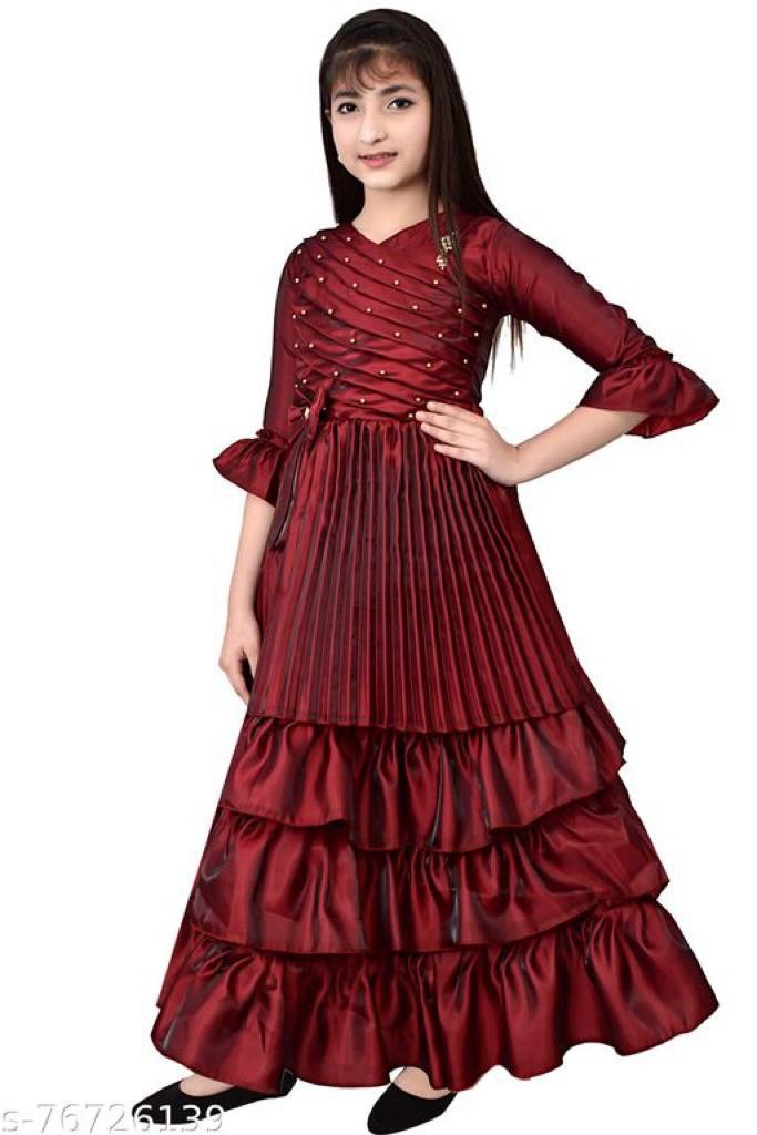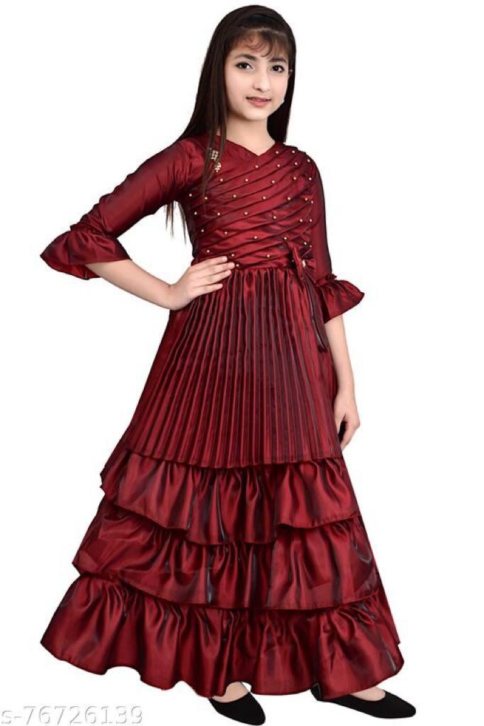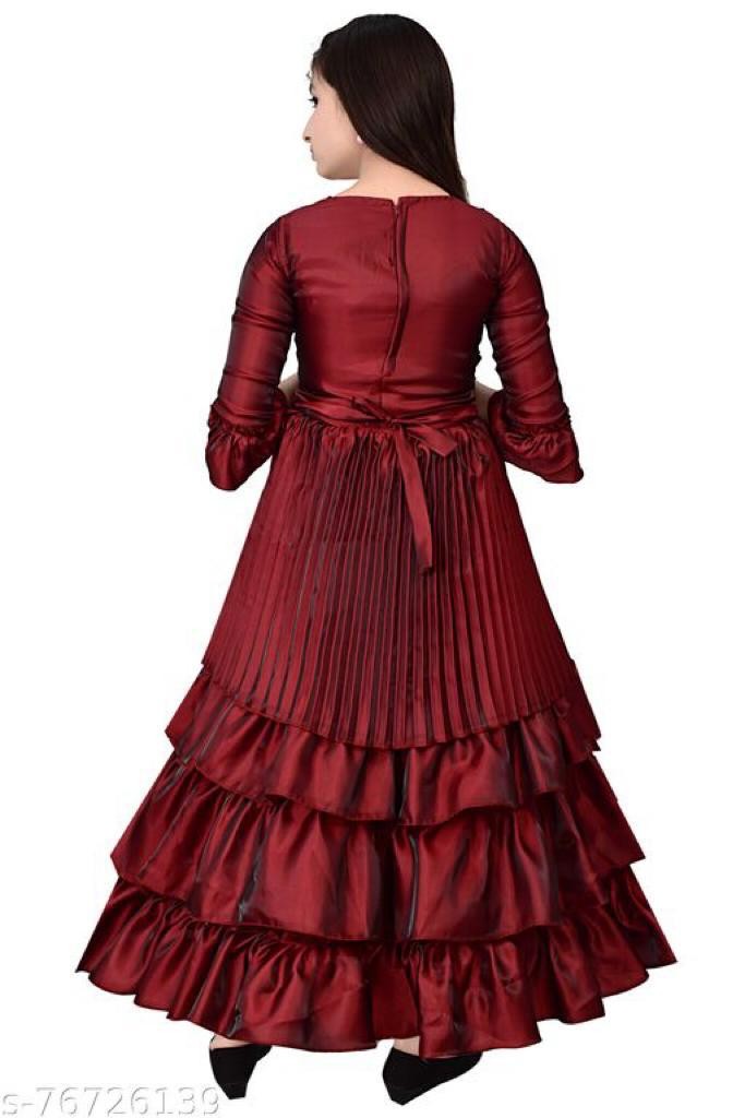 Girl's Blackberry Silk Long Frill Gown Dress Pack Of 1 ( Maroon )