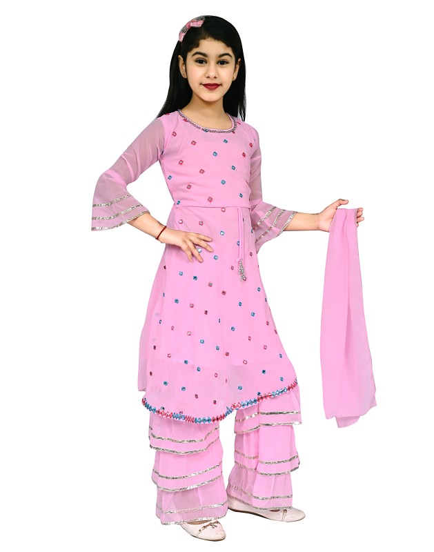 Girl's Georgette Mirror Work Kurtis And Palazzo Set Pack Of 1 ( Pink )