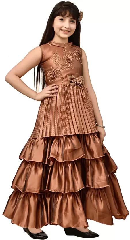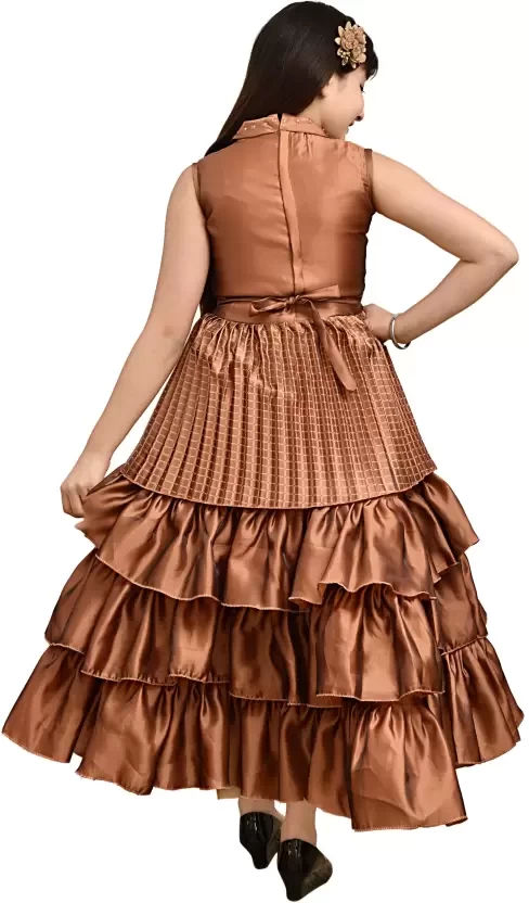 Girl's Long Floor Length Silk Satin Frill Gown Dress Pack Of 1 ( Brown )