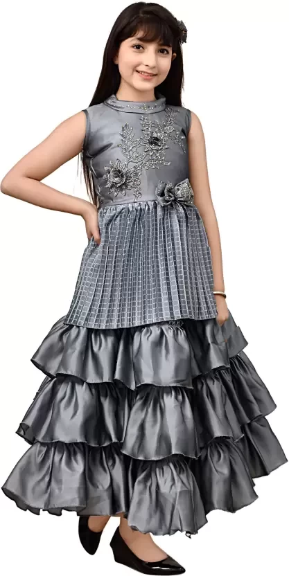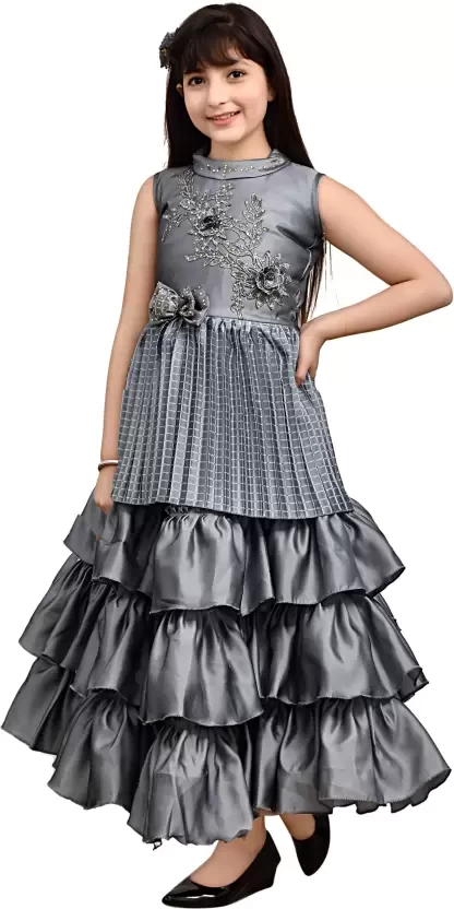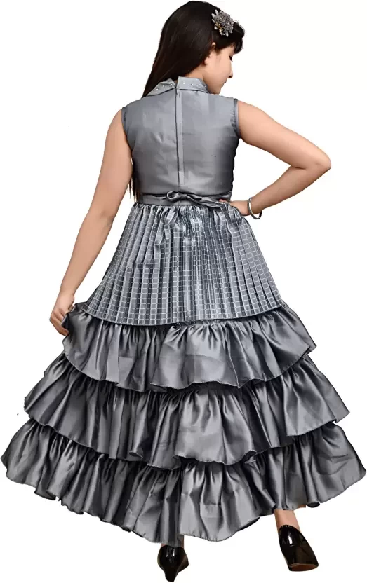 Girl's Long Floor Length Silk Satin Frill Gown Dress Pack Of 1 ( Grey )