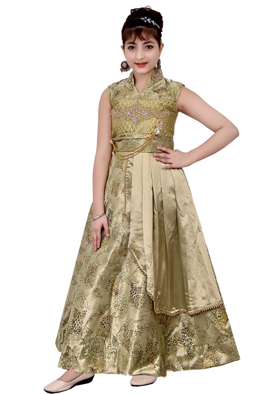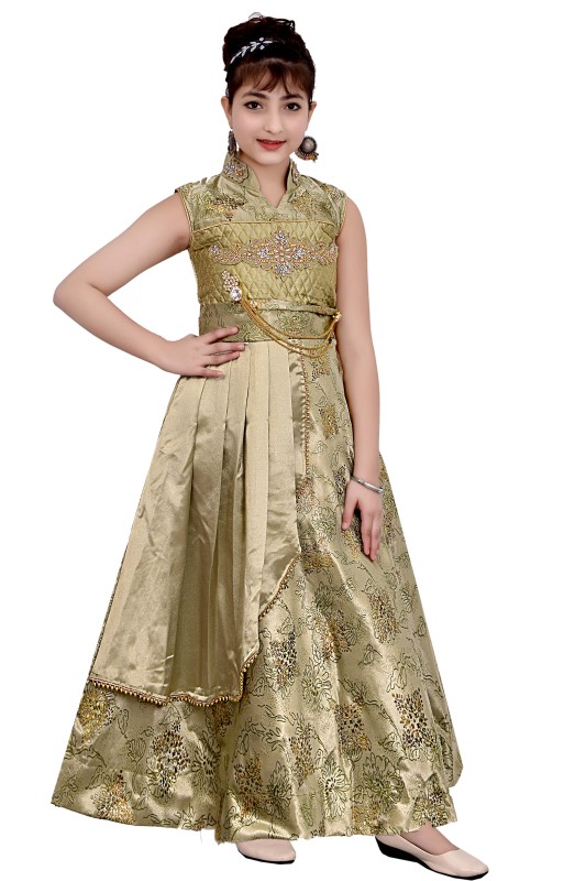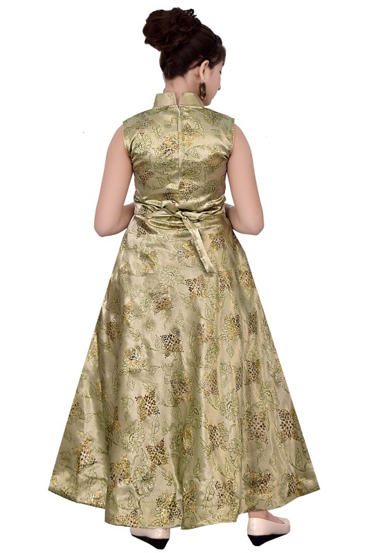 Girl,s Satin Floral Print Long Maxi Gown Dress Pack Of 1 ( Green )
