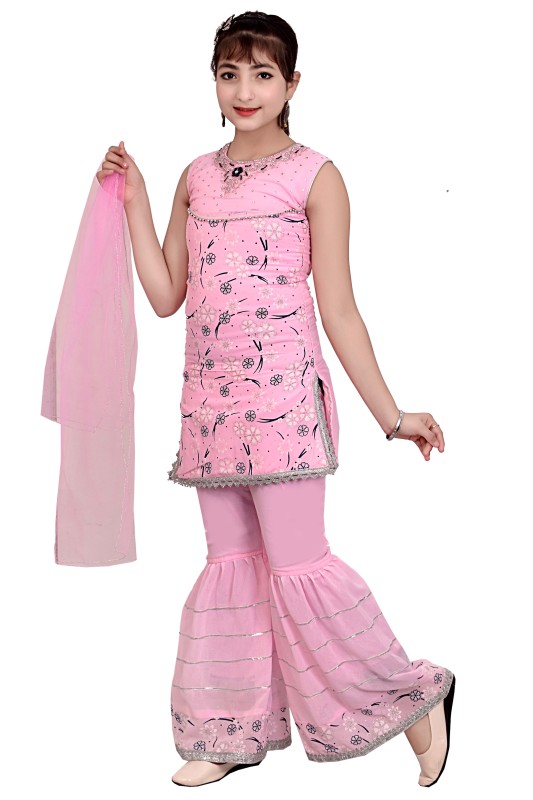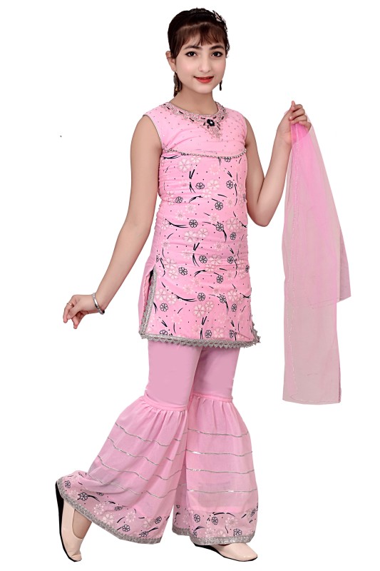 Girl's Silk Blend Kurti with Sharara and Dupatta Set Pack Of 1 ( Pink )