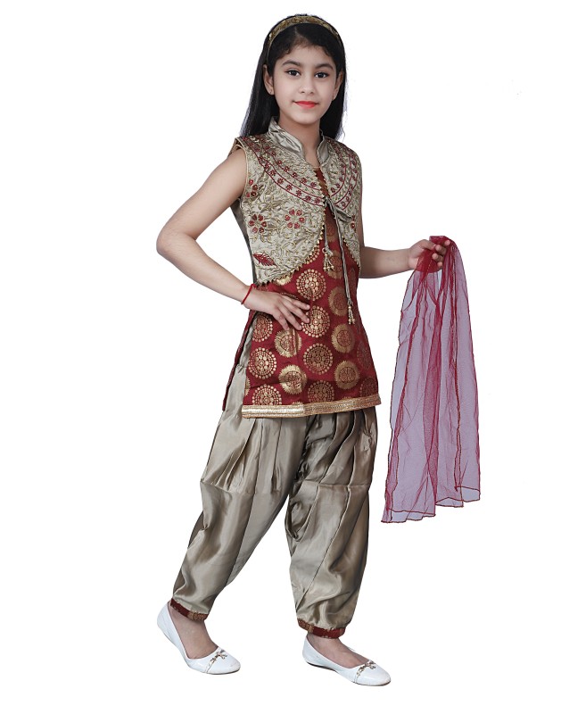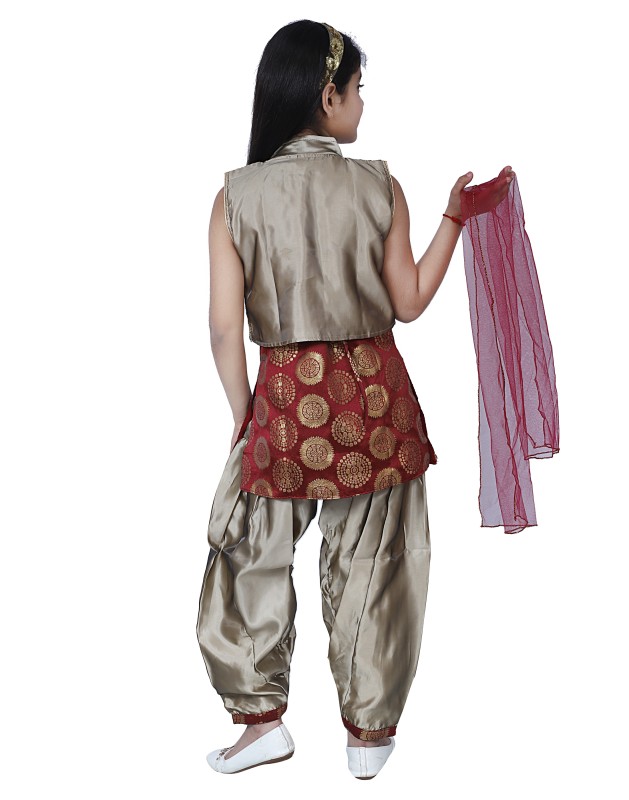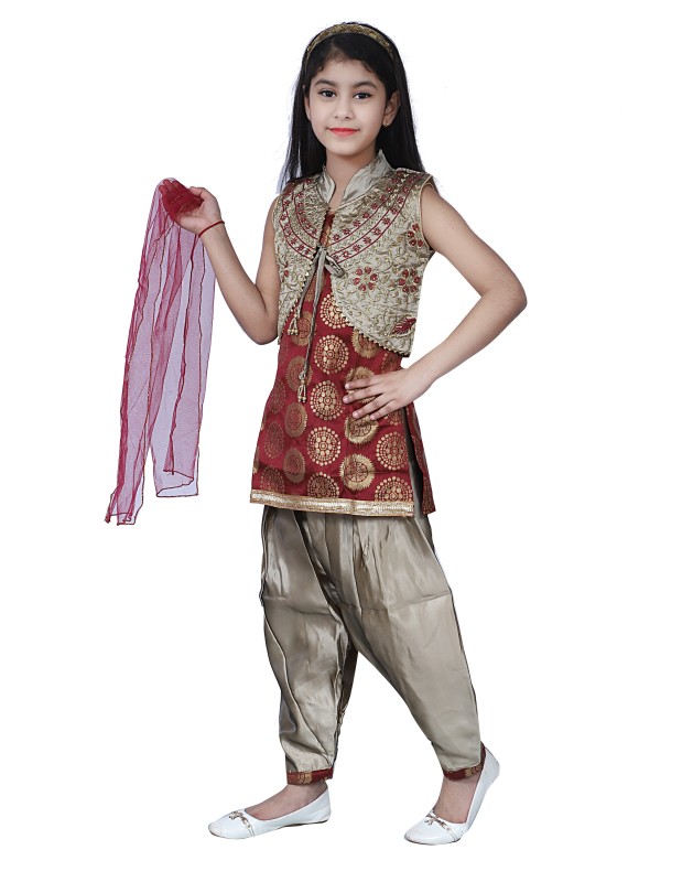Girl's Silk Blend Sleeveless Kurtis & Patiala With Dupatta Set ( Red )