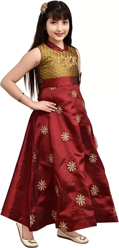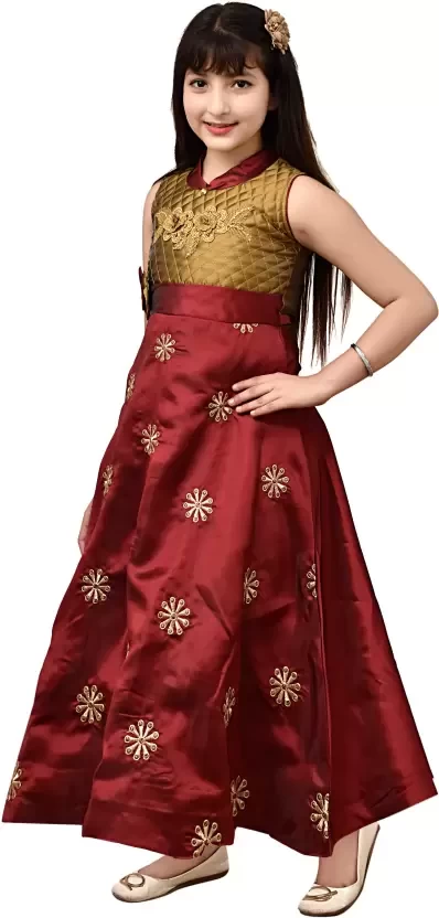 Girl's Silk Satin Embroidery Work Long Gown Dress ( Red )