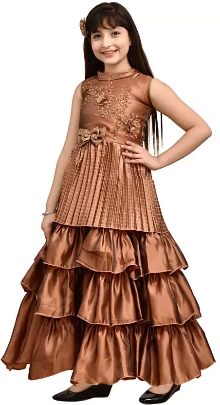 Girl's Long Floor Length Silk Satin Frill Gown Dress Pack Of 1 ( Brown )