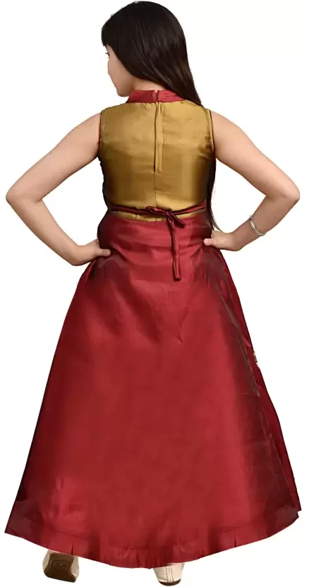 Girl's Silk Satin Embroidery Work Long Gown Dress ( Red )